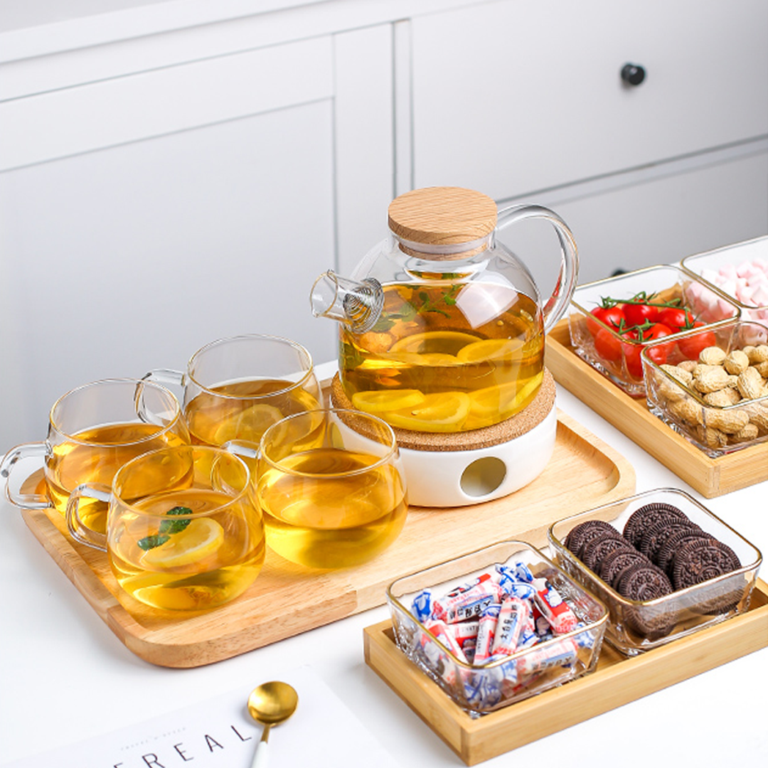 - Glass teapot, with glass cups, candle teapot warmer, and Oak Wood carry tray.