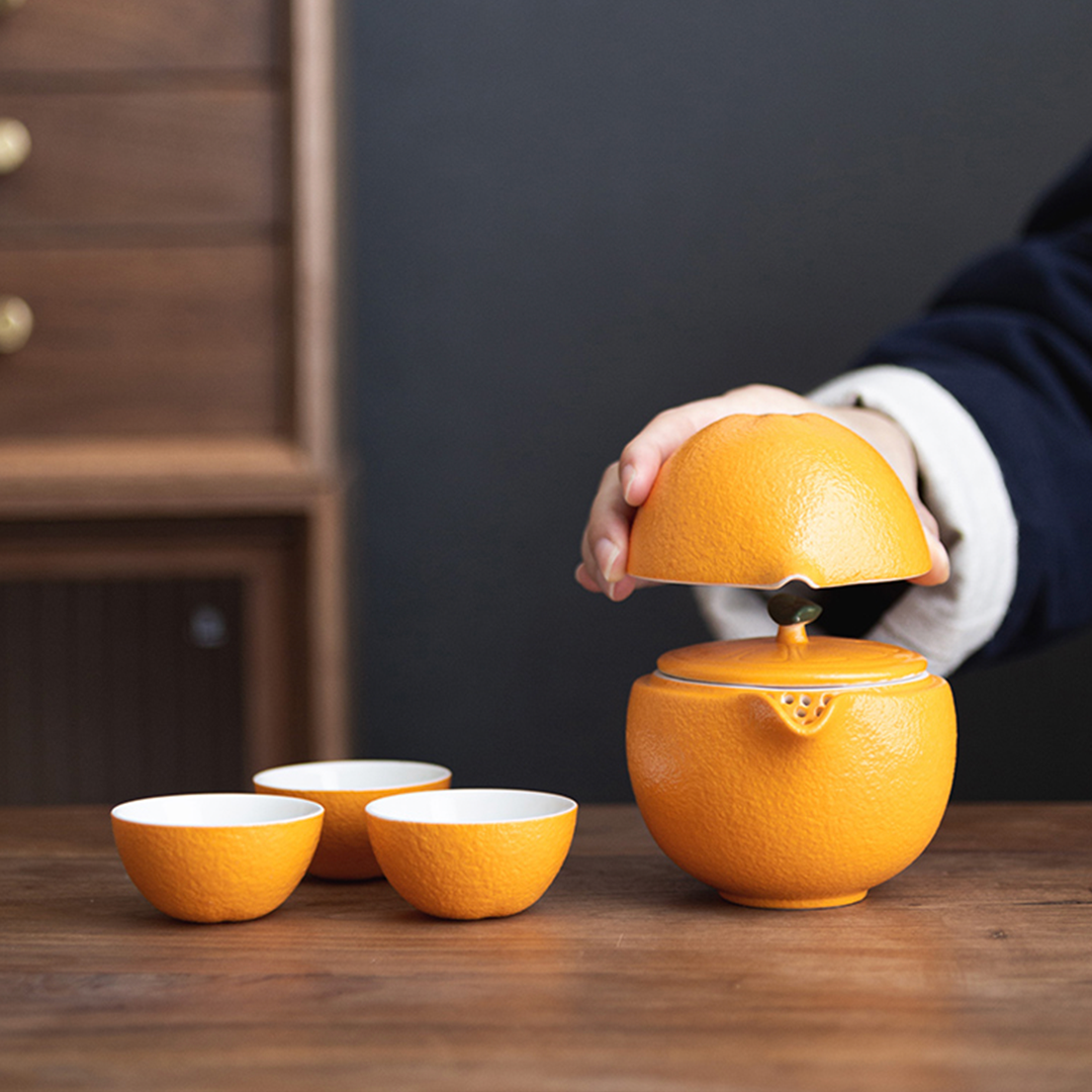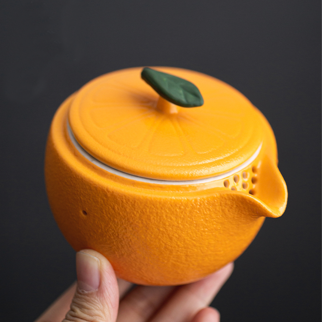 Beautifully hand-crafted tea set mimicking the details of the fruit, orange.